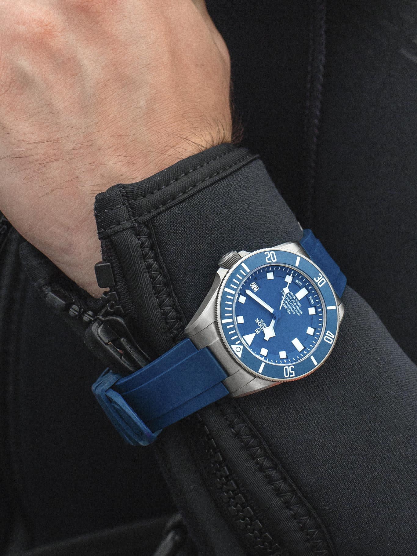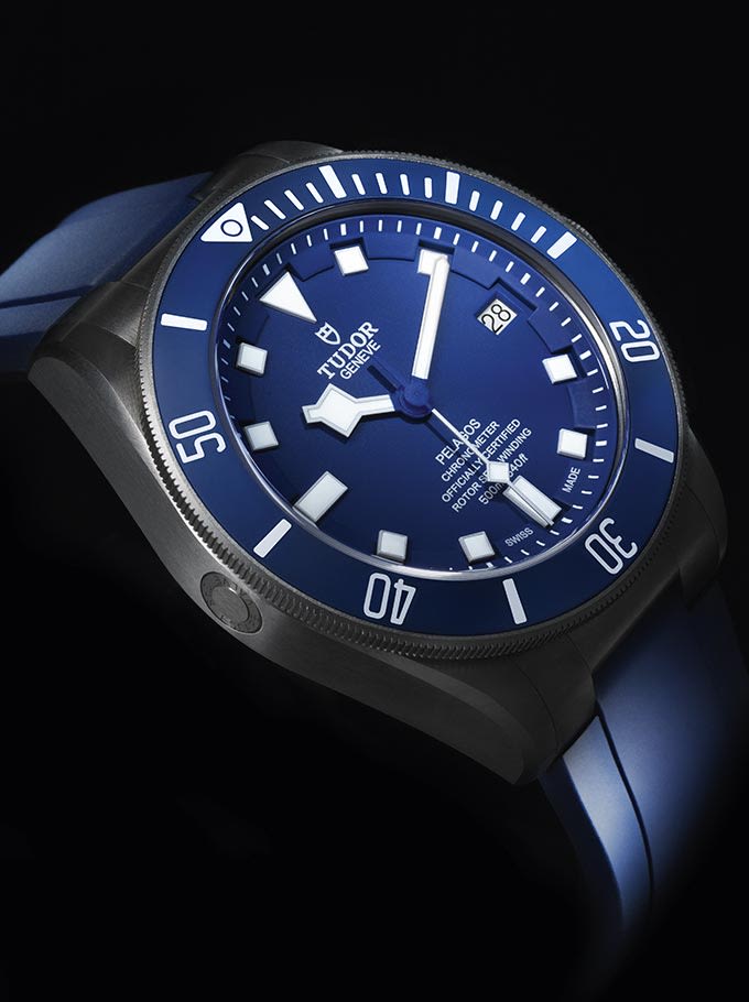 As the name suggests and thanks to its technical features, the TUDOR Pelagos is truly at home underwater, whether on the wrist of a free diver or at great depth in a diving bell. This model’s impressive list of technical features includes being waterproof to 500 meters (with each watch being factory-tested to 625 meters), titanium case and bracelet (40% lighter than stainless steel), patented auto-adjusting clasp, TUDOR Manufacture Calibre with 70-hour power reserve and COSC-certification, helium escape valve and fully luminescent display.