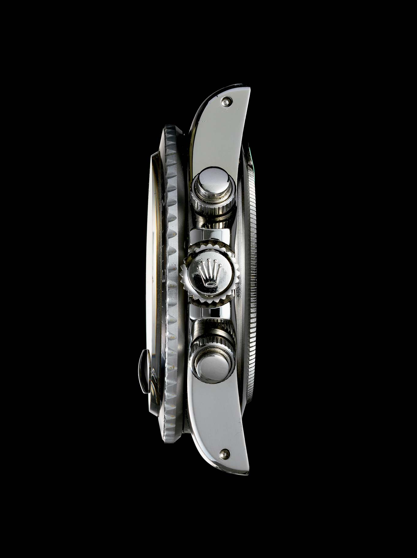 The dials of these first three references were identical and comprised three colours: grey background, black counters and a minute track on a white background. In addition, they had unconventional luminous pentagon-shaped painted hour markers that earned them the nickname “home plate” in collectors’ circles because they were reminiscent of the shape of the home plate on a baseball field. Finally, a last particularity, the chronograph minute counter consisted of 45 minutes, an unusual variation on the more common 30-minute counter. Thanks to their waterproof Oyster-type cases, and their screw-down winding crowns, these chronographs were waterproof to a depth of 50 metres. Their screw-down pushers prevented any accidental engagement of the chronograph.
