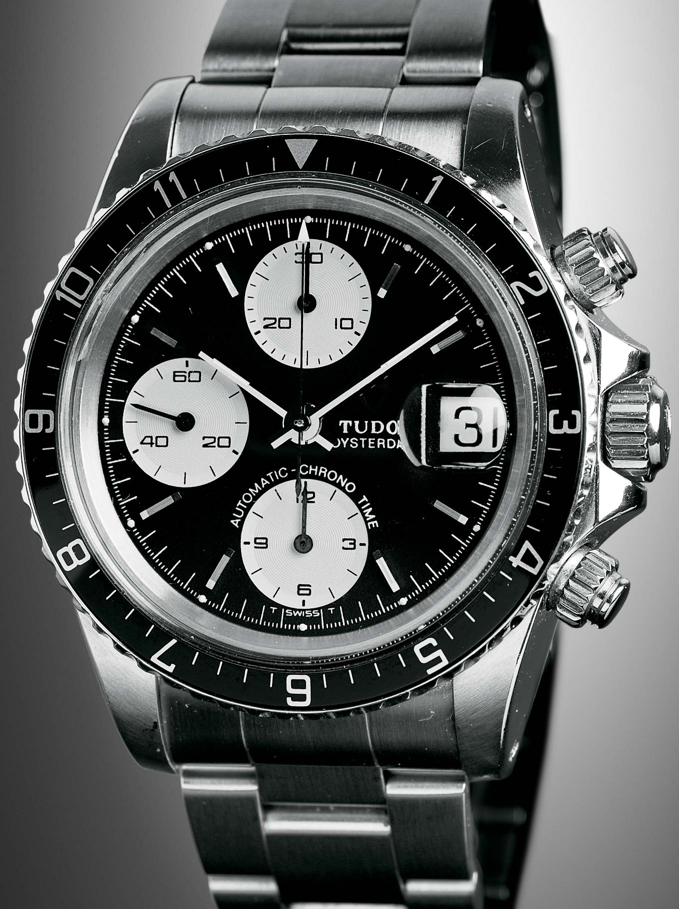 In 1976, TUDOR presented a new family of products which constituted a small revolution for the brand. Indeed, these new Prince Oysterdate watches were the first chronographs in the history of TUDOR to be equipped with self-winding movements. Listed under the name Prince Oysterdate, they were also known by the names “AUTOMATIC CHRONO TIME” or “CHRONO TIME” referring to the signatures displayed on their dials. While their cases retained the general lines of the previous families, they became thicker to accommodate the rotor of the self-winding movement, which earned them the nickname “Big Block” in collectors’ circles. The name “Big Block” endured in the following 79100 series introduced in 1989, which featured only minimal modifications. Like preceding generations, the 9400 series consists of three references distinguished one from the other by their type of bezel, a feature that is also present on the “Big Block” models of the 79100 series. Likewise, several dial variations were available under the same reference number. Two aesthetic trends characterise them: one freely inspired by the spirit of the dials of the previous two series, sometimes called “Exotic” by collectors; the other, much more illustrated in the catalogue, emphasising a significant dial-counter contrast with black and white or sliver and white combinations. The movement at the heart of these new chronographs was the Valjoux Calibre 7750. Having the same diameter as the manually wound Valjoux 234, 30.4 mm or 13 lines, it was 1.5 mm thicker than the latter and had a frequency of 28,800 beats per hour. Its chronograph mechanism was a highly reliable cam and oscillating pinion system. The architecture of this new movement brought about a reorganisation of the dial with the addition of an hour counter, the transfer of the group of counters towards the left of the dial, and the relocation of the date aperture to 3 o’clock.