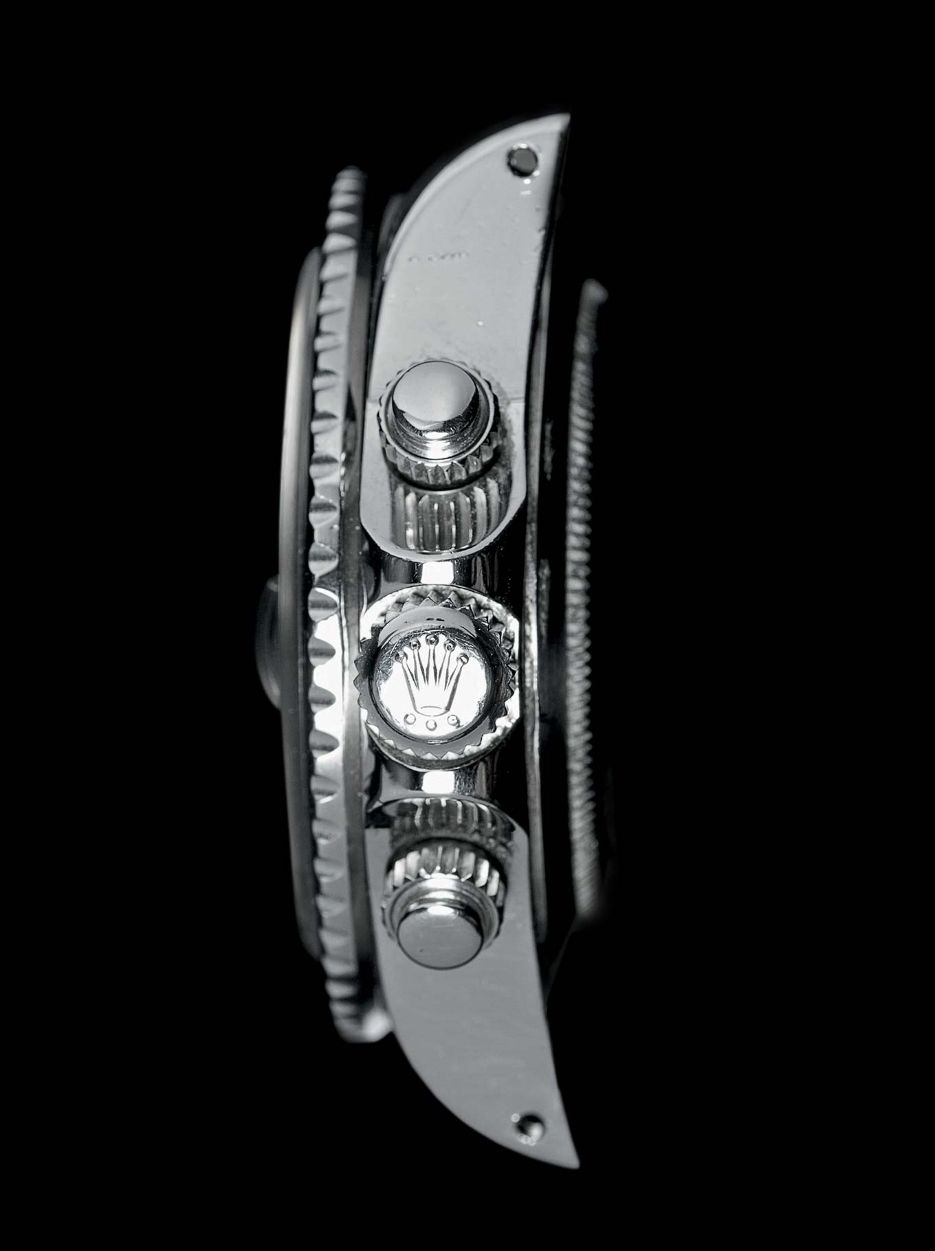 In spite of its official name, the Prince Oysterdate chronograph series does not display its name on the dial. Instead the indications “CHRONO TIME”, as on the 1976 model presented here, or “AUTOMATIC CHRONO TIME” on other dial variations are displayed. The version of reference 9430/0 illustrated on the following page presents a black dial with three white counters with pronounced striations on two levels. The introduction of the self-winding Valjoux chronograph Calibre 7750 brought an additional innovation to the Oysterdate chronographs in the form of a rapid date change function. Indeed, while on the previous series one had to turn the hands around the dial many times to set the date after a period of non-use, now the position of the winding crown allowed direct access to the date disc.