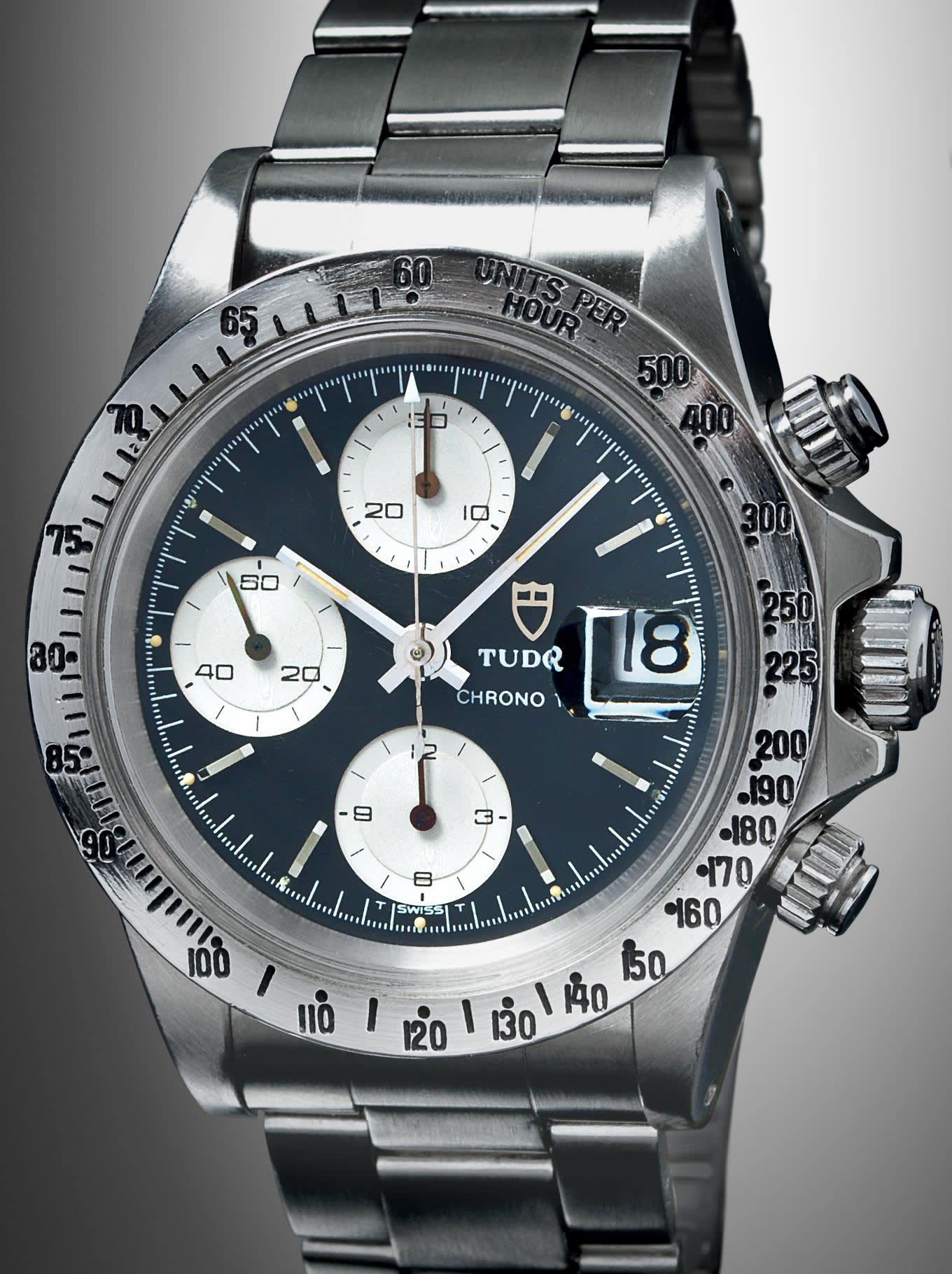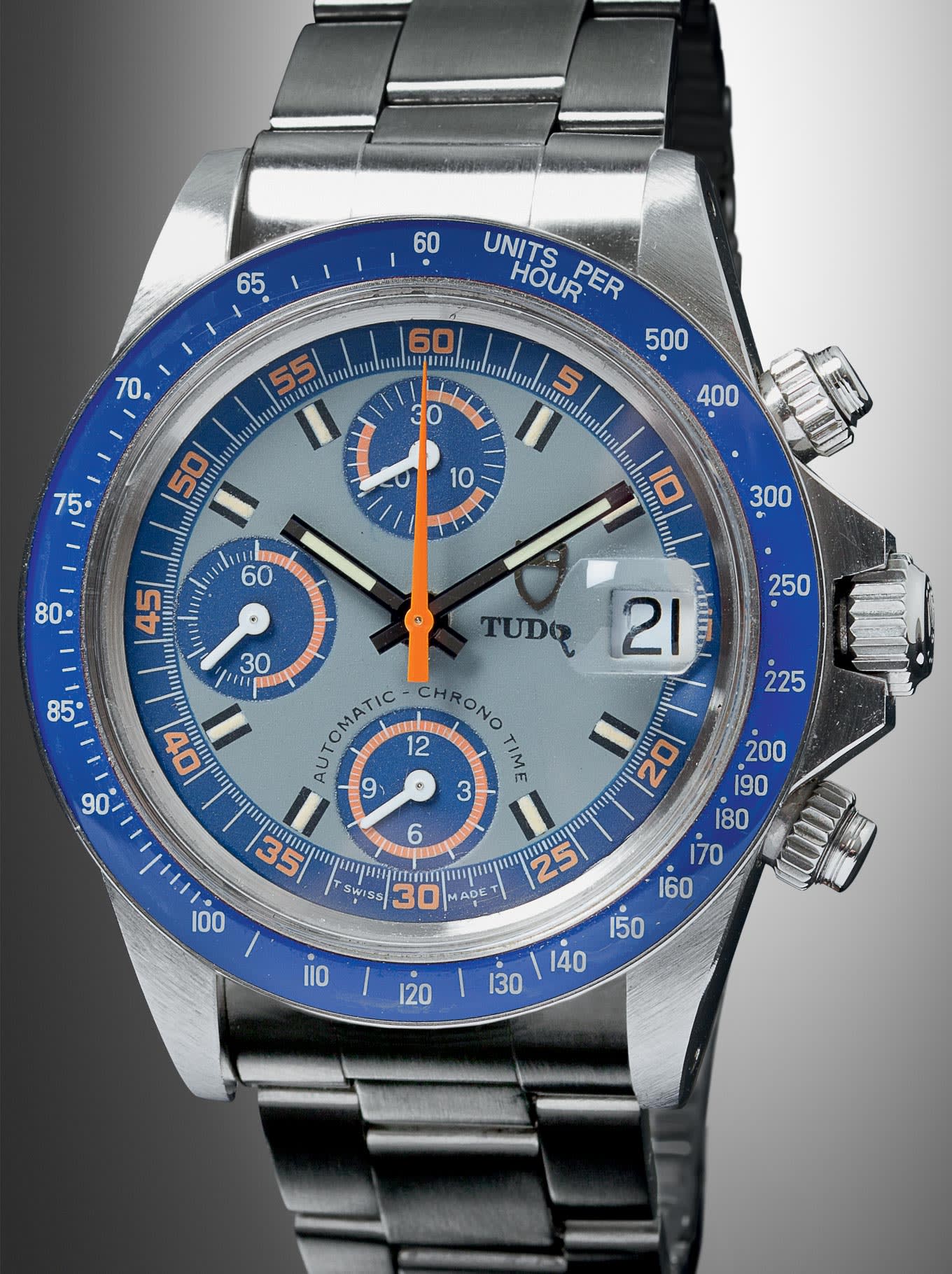 Some series stood out due to a special feature. They were equipped with a unique alternative square-shaped type of protection for the winding crown, which gave them an even more dignified style. This specific feature was known among collectors as “Square Guards”. The dial of reference 9420/0 of 1985 shown here was called “Exotic”. Grey with blue areas and orange inscriptions, it was reminiscent of a colour combination made famous by the TUDOR Oysterdate “Montecarlo”. In another nod to the original TUDOR chronograph dials, the hour markers were painted. Its vivid blue Plexiglas bezel was also inherited from its ancestor, reference 7149/0.