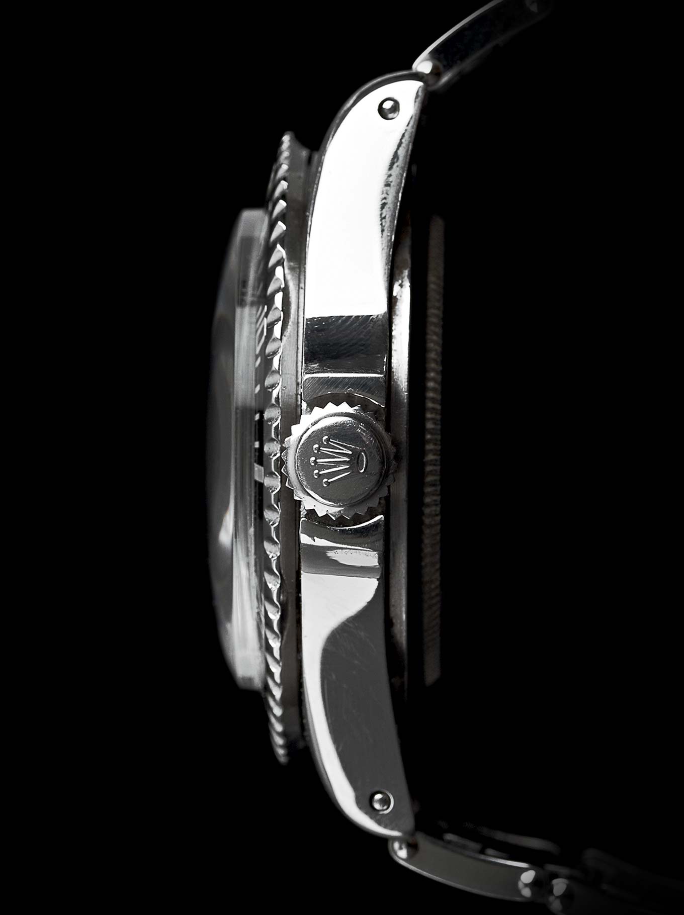Renamed “Big Crown” by collectors, an allusion to its 8 mm winding crown, reference 7924 appeared in 1958. At first glance similar to its predecessors, it presented a fundamental innovation in that its waterproofness was from then on doubled to a maximum immersion depth of 200 metres. To reach this new threshold, the Submariner case, 37 mm in diameter, had been made thicker and was equipped with a larger screw-down crown. A new Tropic-type Plexiglas crystal, thicker and dome-shaped, was installed for better resistance to great pressure. With the same self-winding Calibre 390 as reference 7922 at its heart, this new Submariner bore at 6 o’clock on its black lacquered dial the inscription “200 m = 660 ft”, a reminder of its waterproofness guarantee. Its hands reverted to the characteristic Submariner design. Its Oyster-type bracelet with riveted links, reference 7206, bore the Rolex signature.