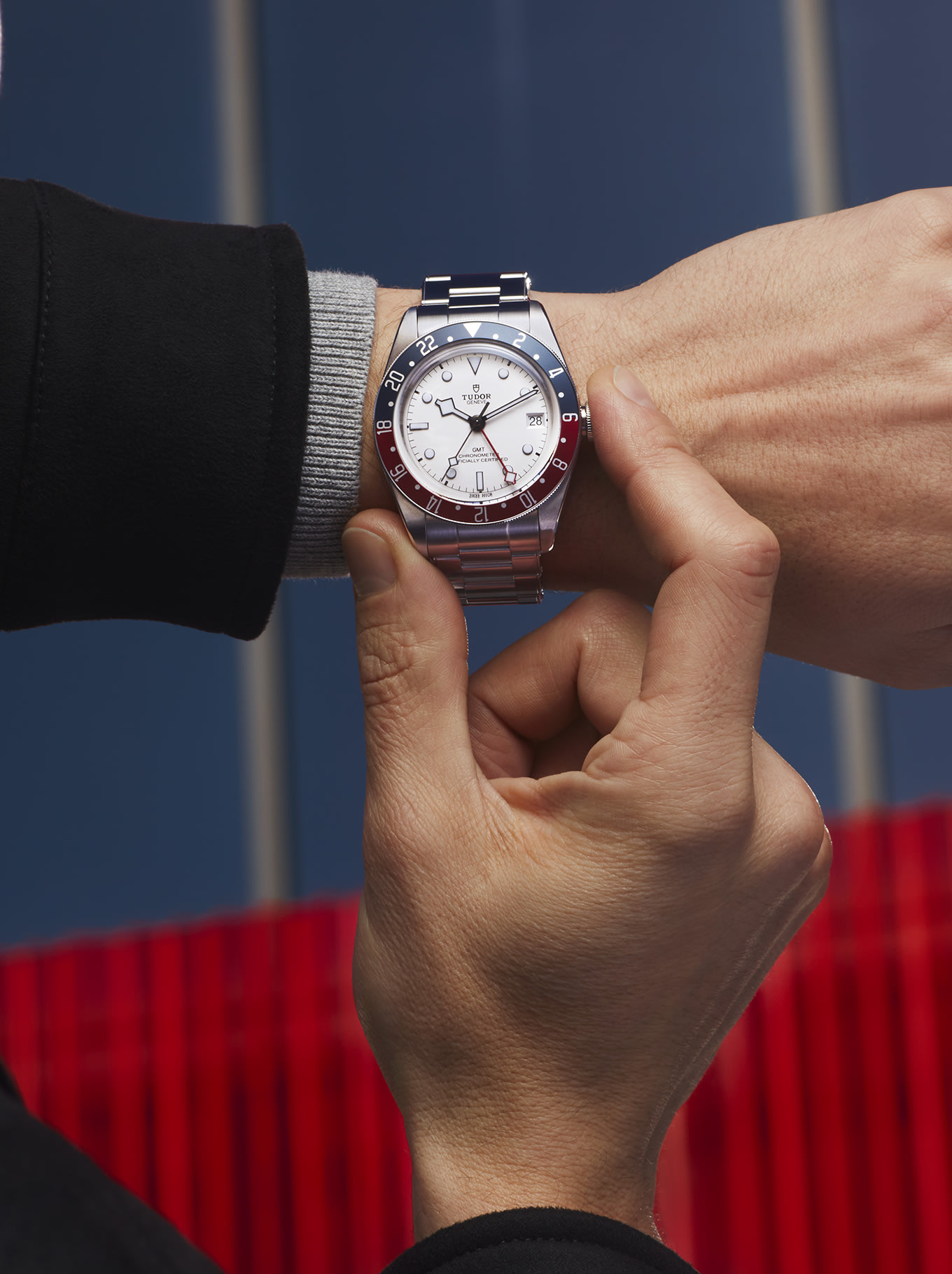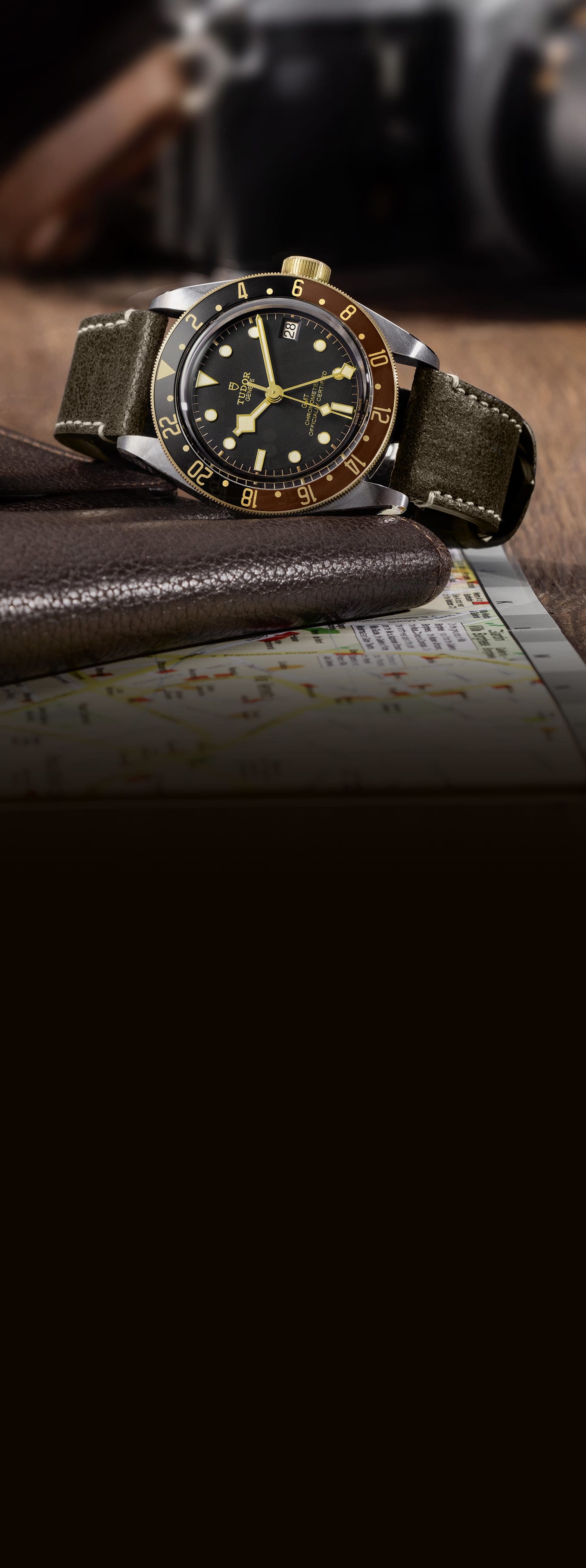 TUDOR's famous Black Bay divers' watch is available with a GMT function that establishes local time without losing sight of the time in two other time zones. Fitted with the Manufacture Calibre MT5652, the Black Bay GMT sports a 24-hour graduated rotating bezel with two colours.
