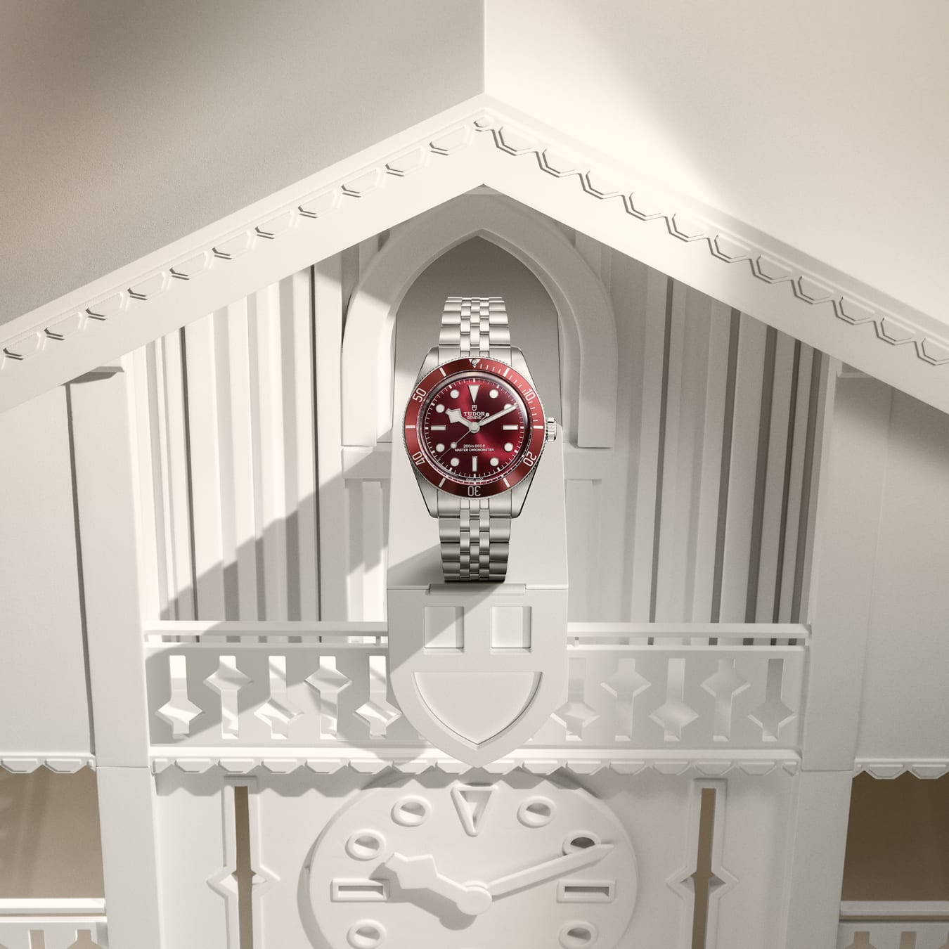 This new edition of the Black Bay 58 retains all the core design elements from TUDOR throughout the ages and includes aesthetic notes from a prototype TUDOR Submariner ref. 79190 developed in the ‘90s. The watch boasted a brilliant burgundy dial with a matching bezel. It never saw production, but this design now lives on in the form of a brand-new Black Bay 58. The burgundy unidirectional rotatable bezel offers very prehensible sides and its insert shows subtly curved numerals aligning with the outline of the outer ring.