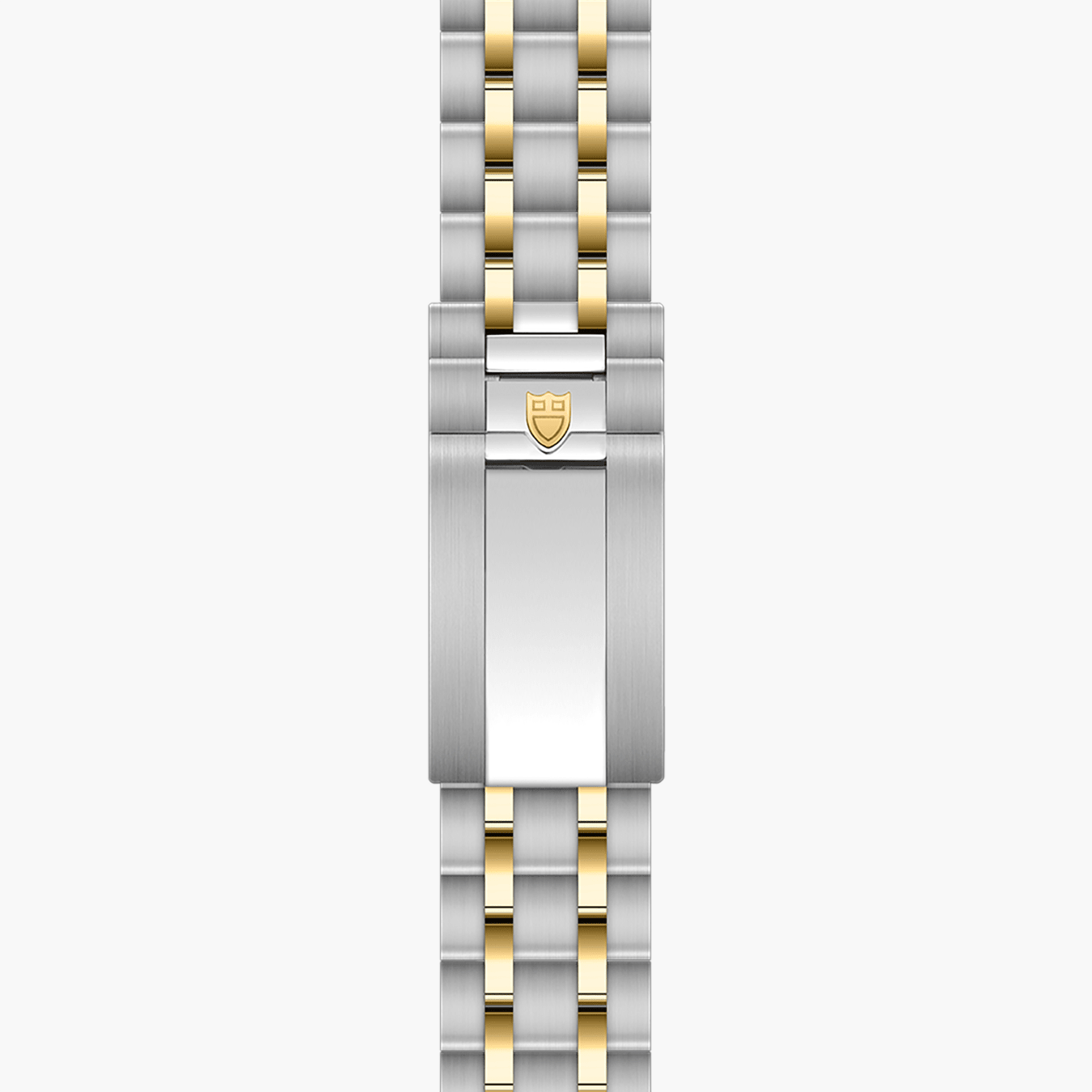 With its integrated metal bracelet ensuring an uninterrupted line with the case, this TUDOR Royal embodies fluidity and unmistakable style. Characterised by its three wide satin-brushed links set between two slimmer polished elements, the smooth quality of its surfaces and edges, as well as the presence of the "T-fit" clasp, emphasise the importance that TUDOR places on ensuring its comfort on the wrist. Available in stainless steel or with alternating links in stainless steel and yellow gold, the meticulous finishes of the models in this range cater to every taste.