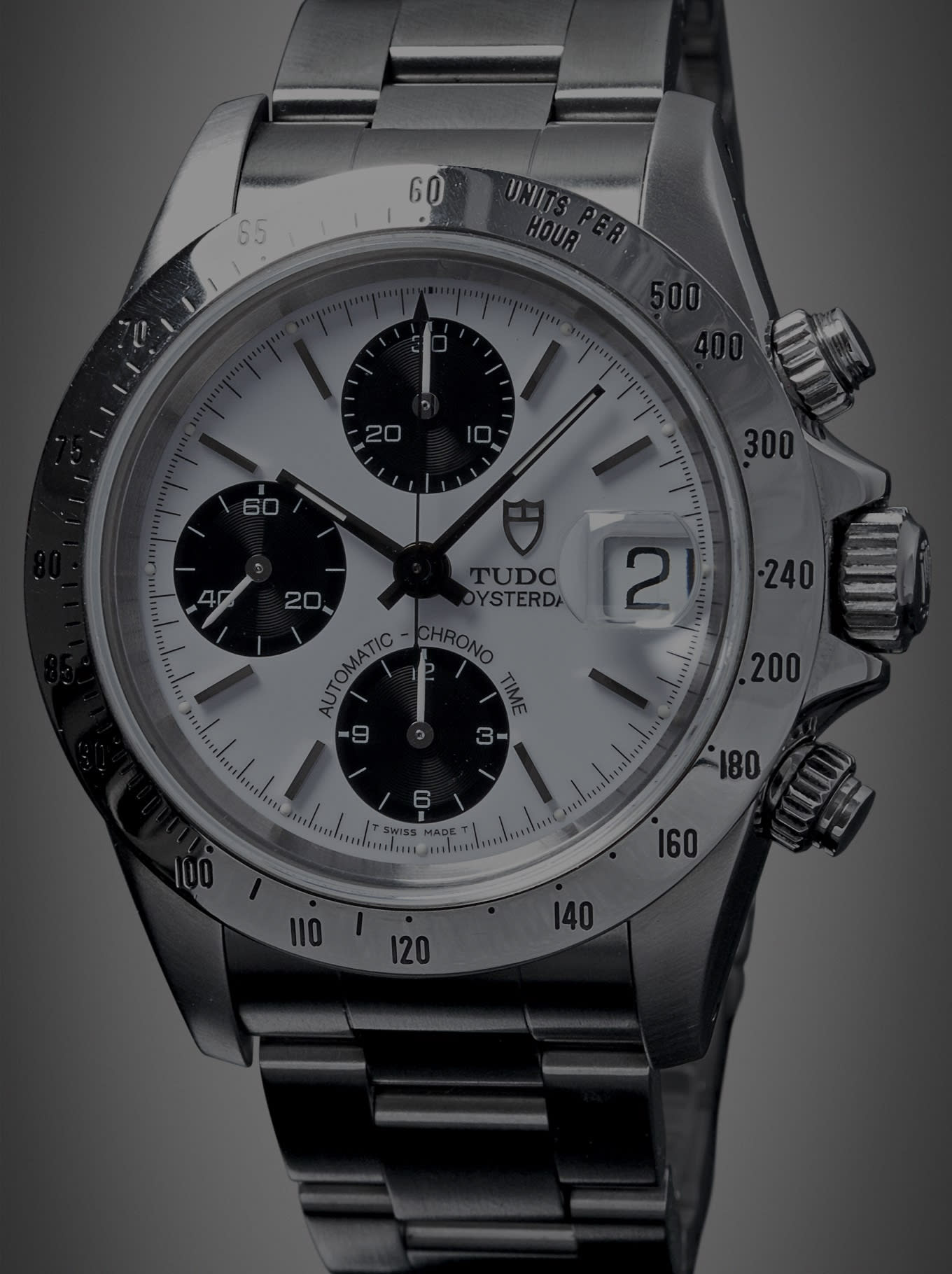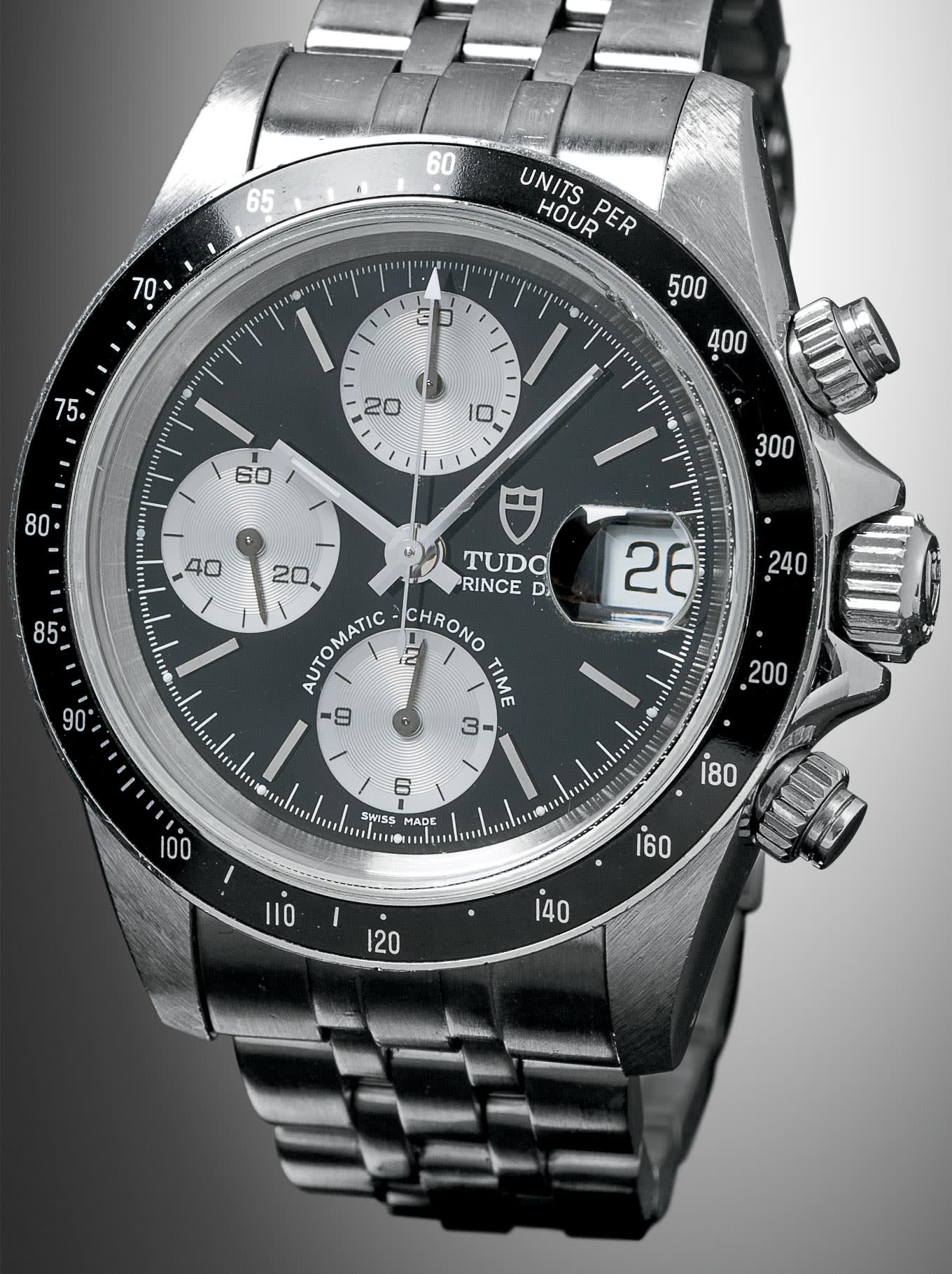 79000系列是帝舵Oysterdate计时腕表在性能和品质方面的升华化身。这款腕表的机芯采用最先进的型号,蓝水晶镜面特别耐磨。型号79280配备钢外圈,外圈上刻有测速计。图示的这款腕表生产于1995年,采用非常漂亮的搪瓷白色表盘,配搭黑色计时盘。表盘上的“OYSTERDATE”字样一目了然,表带摺扣上刻有帝舵表标志。