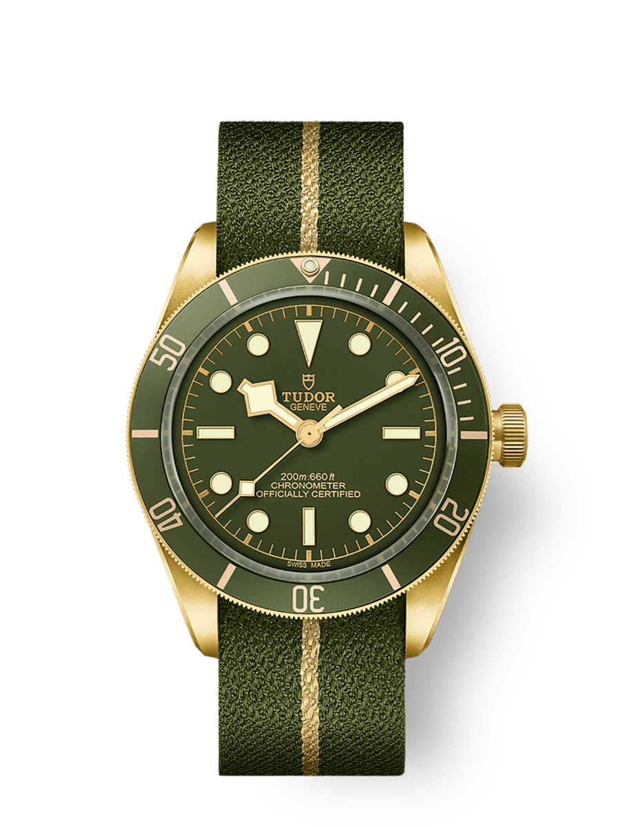 随表附送绿色织纹表带,饰以金色条纹,配18K黄金带扣