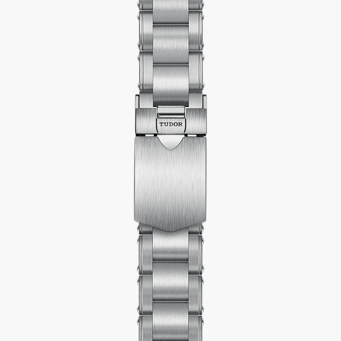 精钢旋入式上链表冠,饰以浮雕帝舵表玫瑰标志,配圆纹磨砂钢上链表冠轴