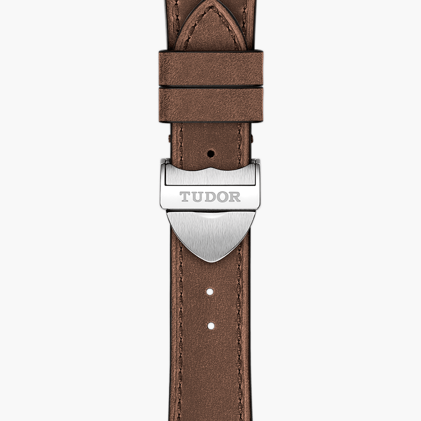 精钢旋入式上链表冠,饰以浮雕帝舵表玫瑰标志,配圆纹磨砂钢上链表冠轴